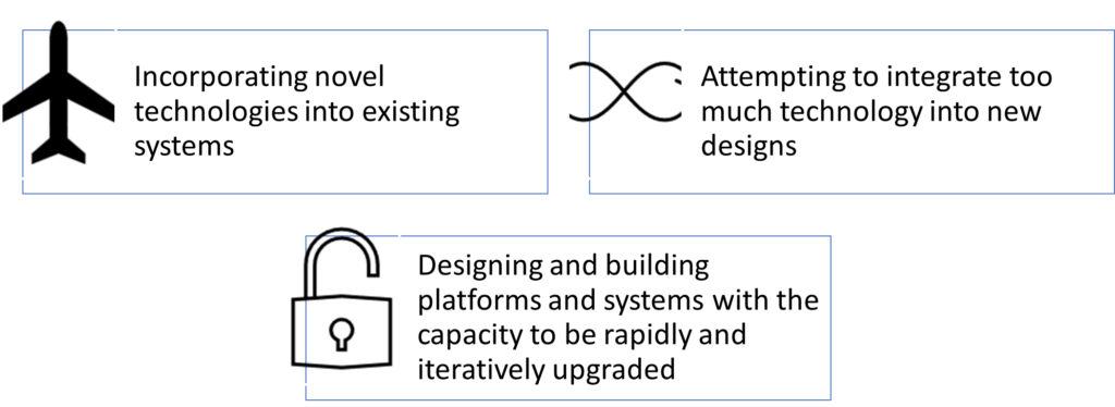 Another component of the technology integration challenge is avoiding the temptation to do too much by attempting to incorporate several technologies into new design simultaneously. For example, the US Nav’s Chief of Naval Operations observed in April of 2021 that some of the delays associated with the Ford class aircraft carrier were due to an overly ambitious technology integration plan. Admiral Gilday advocated for