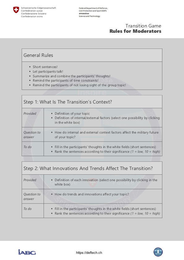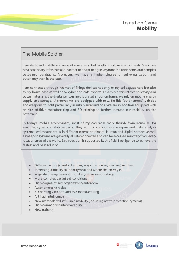 Diese Version des Übergangsspiels wurde ursprünglich für den DEFTECH-Workshop vom 8. Mai 2019 “The future soldier: digital and enhanced?“.