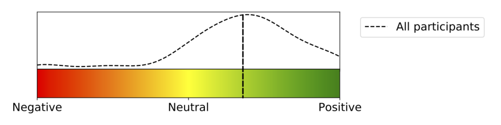 The curve at the top is a Kernel Density Estimation (KDE) [1] of the distribution of the colours for all participants. The reason why we use the KDE instead of a simple histogram, is that it is nicer to look at and gives enough general information while being informative enough. The vertical dashed line indicates the position of the median [2] of the distribution, or in other words it indicates the participant separating the lower half from the top half (in terms of colours). In still other words, 50% of participants are at the right of the dashed vertical line (more positive), and 50% are on the left (less positive). You can see how the tendency between all participants is clearly positive!