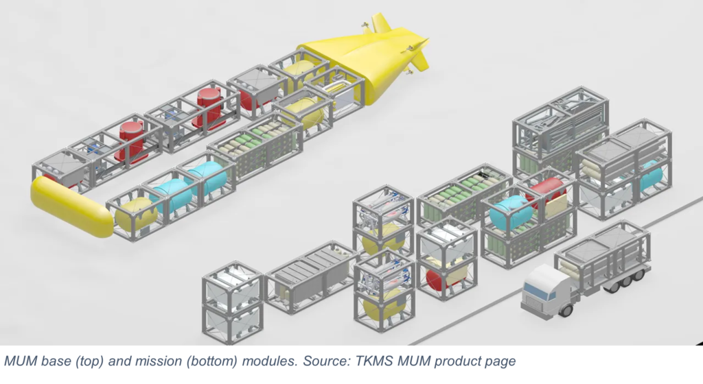 TKMS’ MUM product page stresses its multi-mission capability and innovative design concept that is “composed of almost freely configurable base and mission modules, enclosed by a hydrodynamic casing.” The base and mission modules “are designed as ten- or twenty-foot standard containers, making their transportation and assembly effortless. The combination of base and mission modules enables MUM to fulfil different types of missions as well as to scale its capabilities in endurance or payload capacity.”