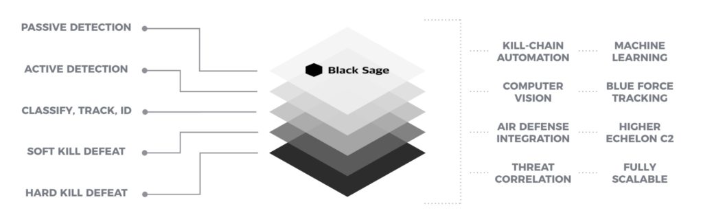 According to Black Sage’s website, “Sawtooth is a multi-mission short range air defense solution combining high performance sensors and effectors with the latest generation of automated command and control software.” It offers both kinetic and non-kinetic solutions, among many other features captured in the image below, such as the capacity to actively or passively detect threats and classify, track, and ID threats.
