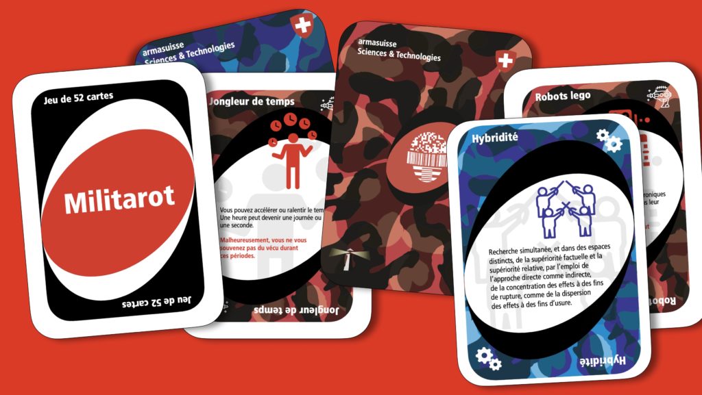 Militarot est un jeu de cartes permettant d’animer différents ateliers créatifs autour de tendances technologiques en considérant de que celles-ci pourraient rendre possible. Ces diverses compétences et produits futuristes apparaissent aujourd’hui comme des super pouvoirs.