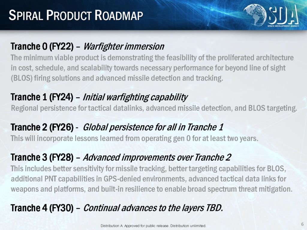 The US Space Development Agency (SDA) launched the first 10 of its 28 Tranche 0 satellites on 2 April using a Space X Falcon 9 Heavy reusable rocket. The launch was the first of two Tranche 0 launches with the second coming in June. In total Tranche 0 will place 20 data transport satellites that will use laser communications (also referred to as “optically connected”) and eight optically connected missile warning and tracking satellites. Optical communications reduce latency of communications and also offer increased security and bandwidth.