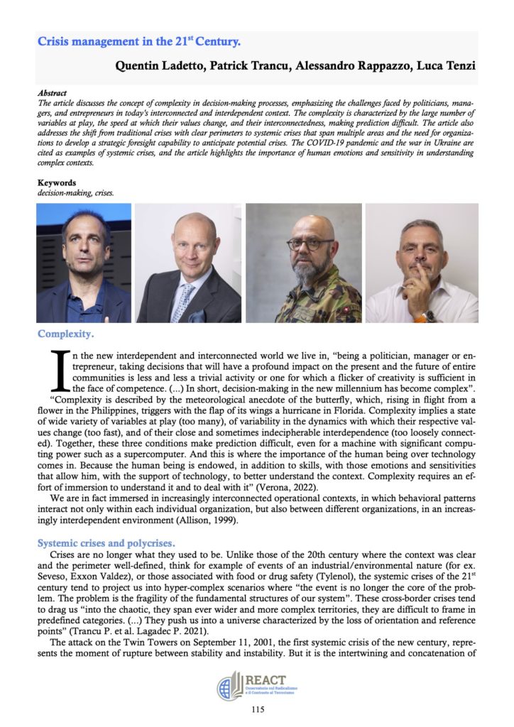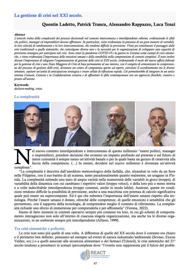 Il testo inoltre discute l’importanza di adeguare l’organizzazione di gestione delle crisi al XXI secolo, evidenziando il ruolo del nuovo ufficio federale per la gestione di crisi e uno Stato Maggiore di Crisi di base permanente al suo interno, con il compito di armonizzare la comprensio- ne del processo di gestione delle crisi, diventare un centro di competenza aperto ad esperti, esercitare il coordinamento tra le diverse strutture, ospitare un’unità di anticipazione strategica e creare cellule di riflessione rapida.