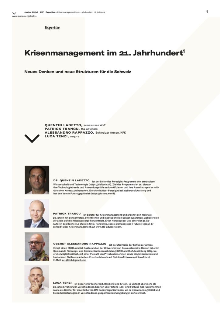 Die vier Autoren analysieren in ihrem Artikel die Grenzen des Krisenmanagementsystems der Eidgenossenschaft und schlagen eine konkrete Neuausrichtung vor, die sie zur Diskussion stellen. Sie gehen aber nicht allein auf organisatorische Fragen ein, sondern legen ein fundiertes Konzept vor.